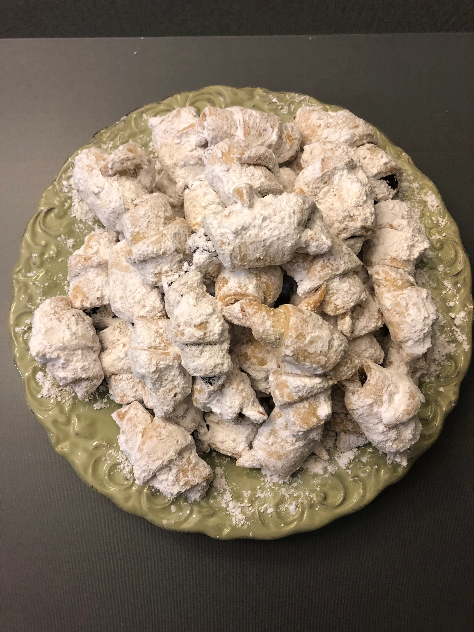 Buttery crescent-shaped cookies filled with jam and ground walnuts, dusted in powdered sugar.